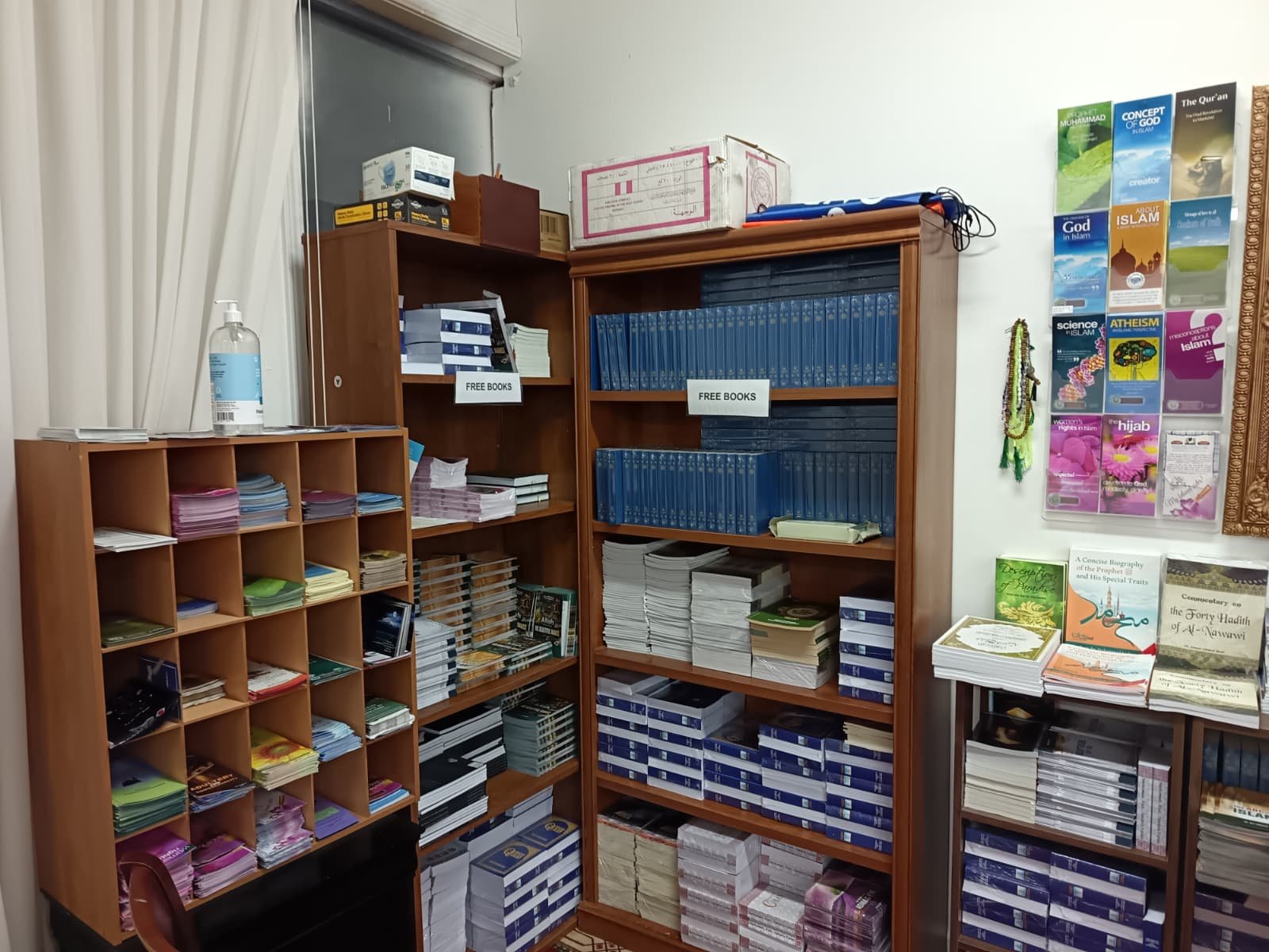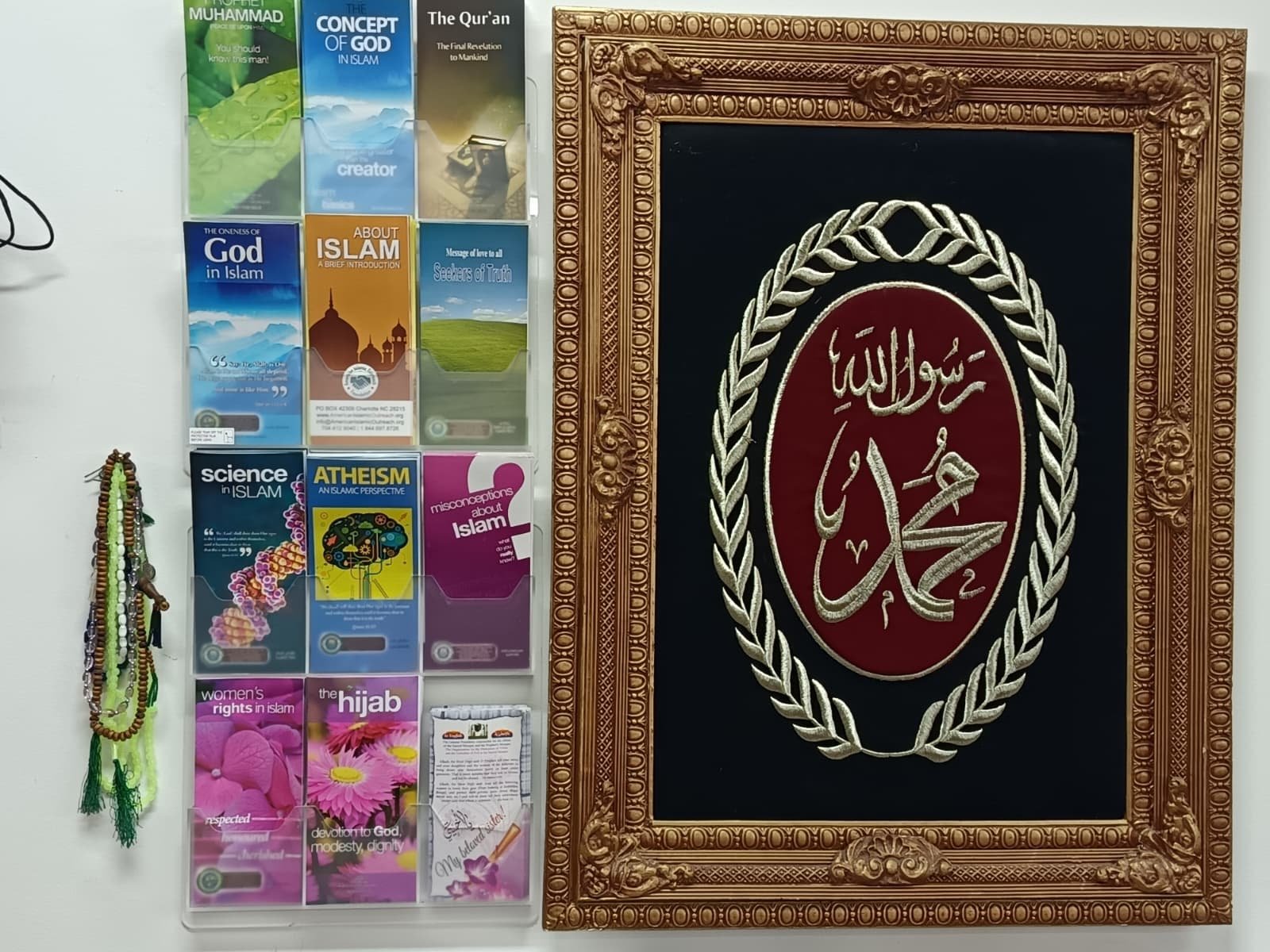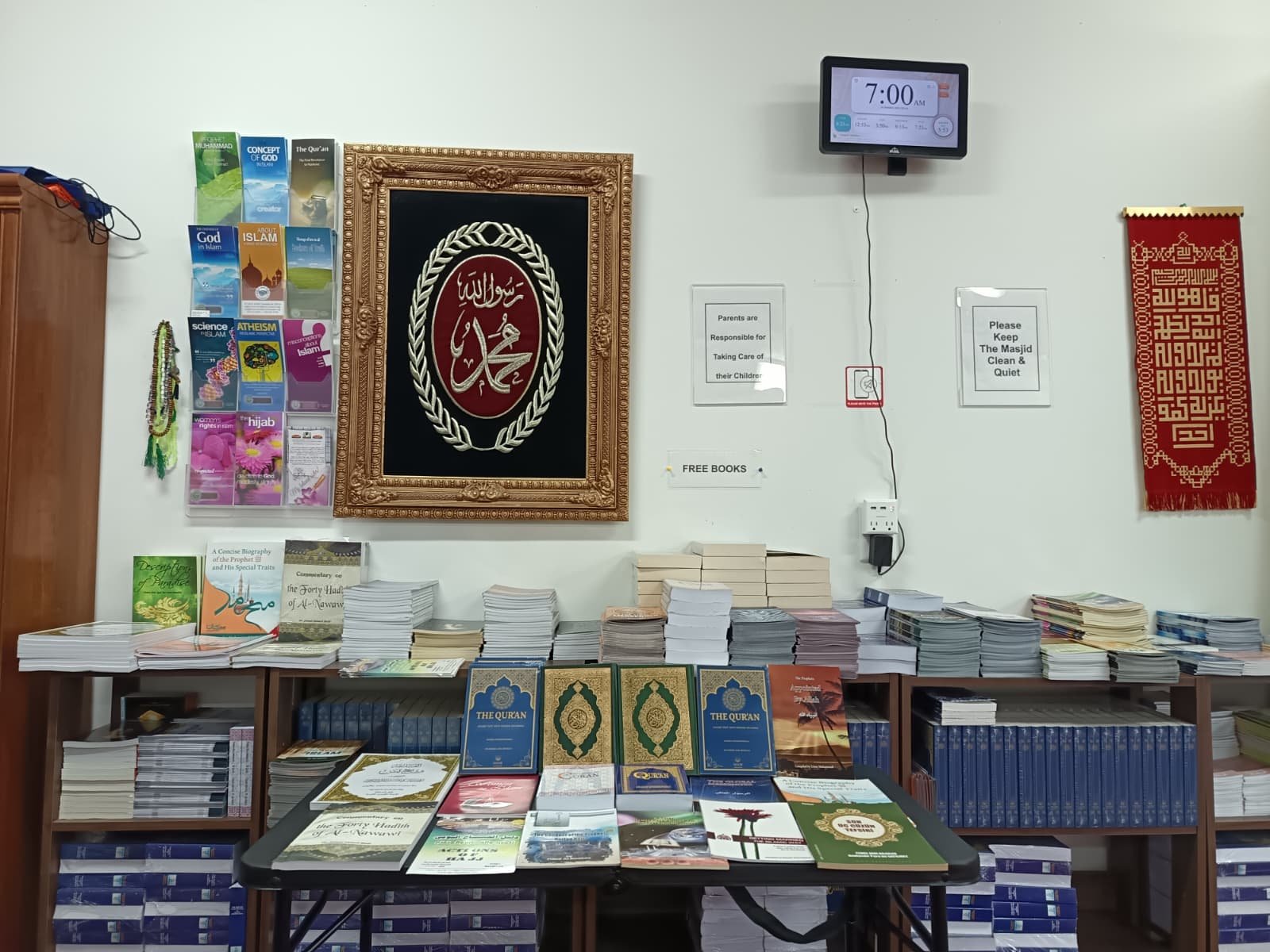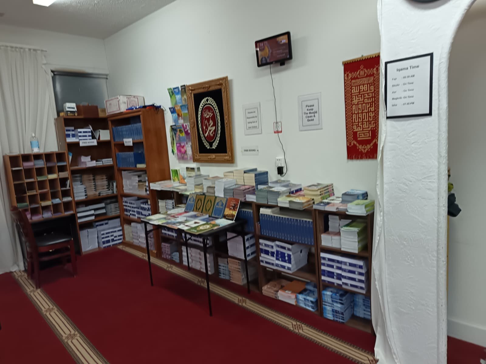 We have a collection of valuable Islamic books, including the Holy Quran (in Arabic, English, and Spanish), the Prophet’s Hadith, and other religious books on monotheism, faith in the one and only God, and belief in the prophets and messengers (peace be upon them), and the final prophet, Muhammad (peace and blessings be upon him). These books are offered free of charge to visitors of the masjid, and can also be mailed to addresses within the United States upon request.